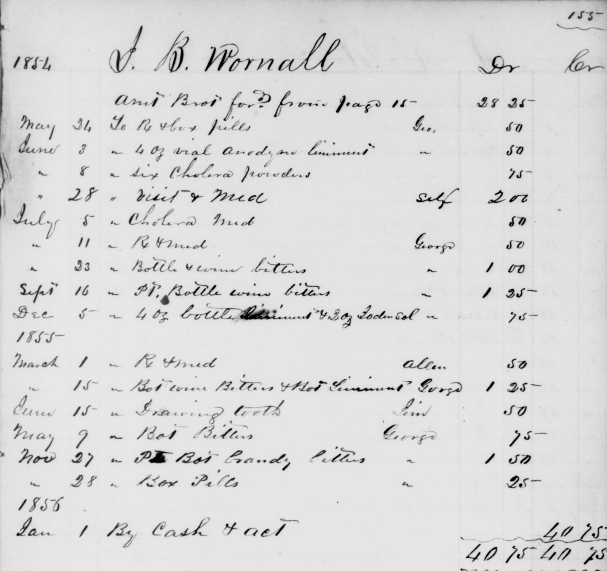 Image: An excerpt of the 1854 account books of Dr. James W. Parker, held by the Missouri Valley Room, Kansas City, Missouri Public Library.