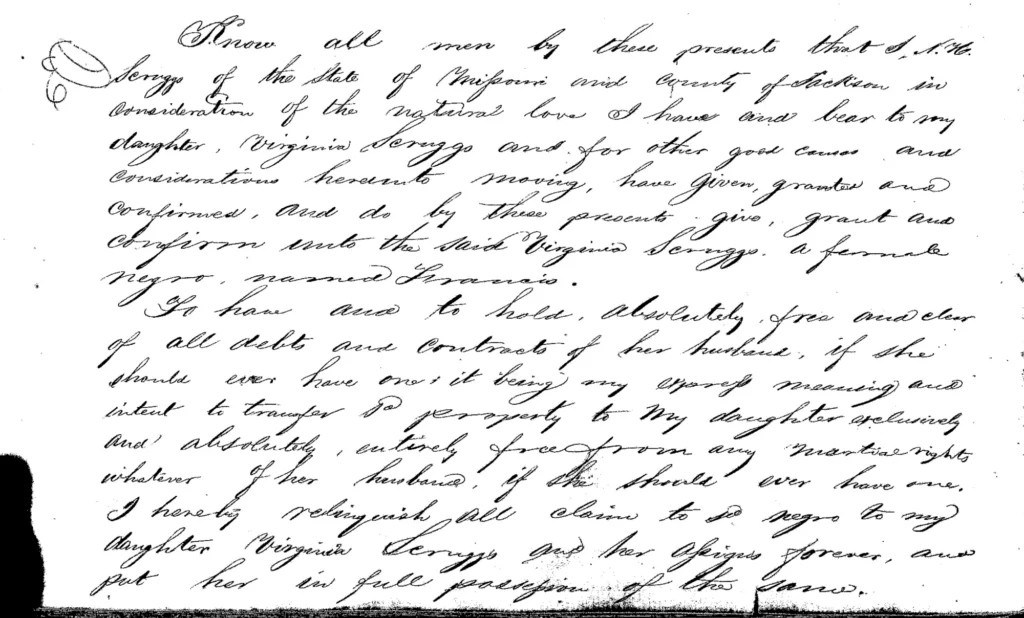 This deed of gift, dated July 18, 1855, shows Nathaniel Scruggs gifting a woman named Francis to his daughter Virginia Scruggs. He expressly states that he gifted the enslaved woman to his daughter “exclusively and absolutely, entirely free from any marital rights whatever of her husband, if she should ever have one.” Virginia was not married in 1855 and would die unmarried two years later.